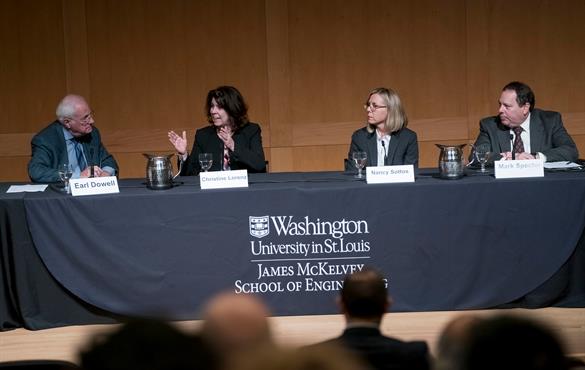 Innovation was a theme in the panel discussion, which included Earl Dowell, former dean of the School of Engineering at Duke University; Christine Lorenz, chief operating officer of Cohesic Inc. and a Washington University alumna; Nancy Sottos, the Donald B. Willet Professor of Engineering in the Department of Materials Science and Engineering and the Beckman Institute at the University of Illinois Urbana-Champaign; and Mark Spector, program officer in the Advanced Naval Platforms Division at the Office of Naval Research.