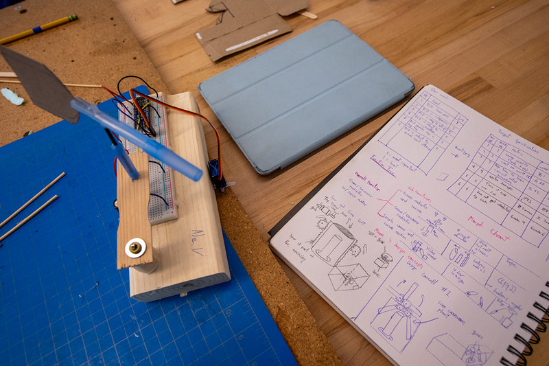 Over the fall semester, the students grappled with many decisions related to their prototypes: Is it better to 3D-print something, or to export a 2D pattern and have a machine cut the needed part out of an existing pane of plastic? Which solution is going to be airtight? How many batteries are needed to operate the mechanism? And, at a practical level, what happens when the 3D printing queue at the makerspace gets too long?