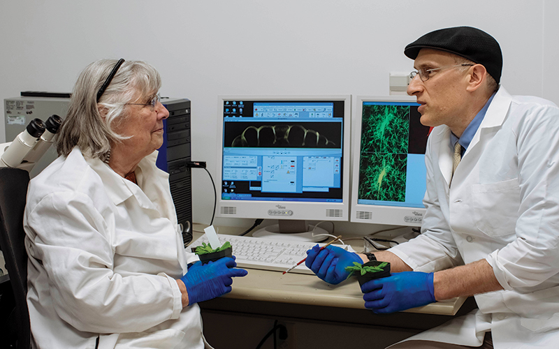 Genin also studies how mechanical signals of plant cells interact with Barbara Pickard, professor emerita of biology and a CEMB faculty fellow. They investigate how plant cells transduce sound and interact with their electromechanical environments with the aim of developing mechanical means of fighting insect invasion and drought.